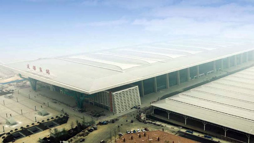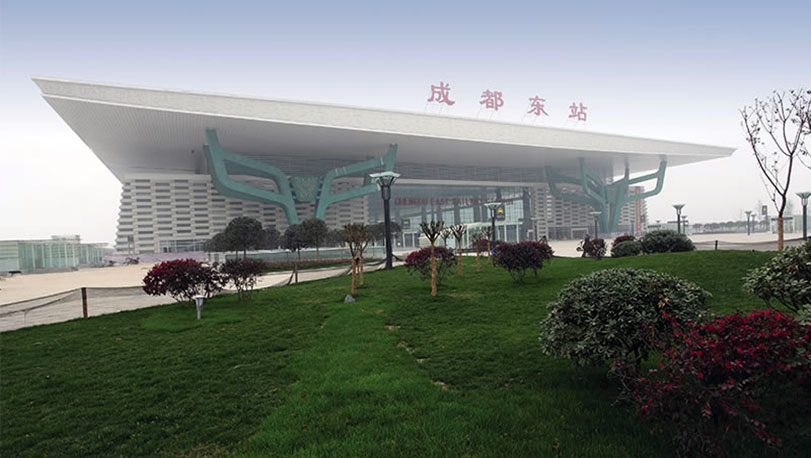 成都火車東站位于成都市東三環路,2010年開始建設,車站面積約22萬平方米。在設計上引入了大量的文化元素,東、西廣場的進出口都用了三星堆的青銅面具元素,屋頂引入了金沙太陽神鳥的火焰造型,被定為一等客運站。使用了寶鋼鍍鋁鋅