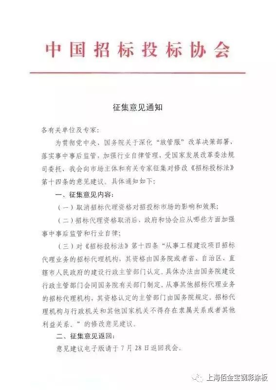7月31日,受國(guó)家發(fā)改委法規(guī)司委托,中國(guó)招標(biāo)投標(biāo)協(xié)會(huì)將組織市場(chǎng)主體、業(yè)內(nèi)專家學(xué)者,就《招標(biāo)投標(biāo)法》第十四條關(guān)于工程招標(biāo)代理機(jī)構(gòu)資質(zhì)管理的條款修訂收集意見(jiàn)。